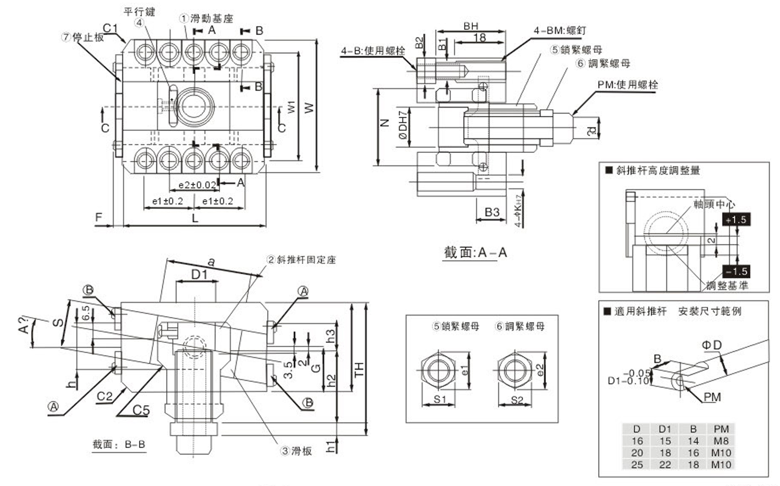 | Catalog No. | 安裝孔尺寸 | ⑤鎖緊螺母 | ⑥調(diào)整螺母 | 斜推桿安裝尺寸 | 停卡闆安裝位置 | ||||||||||||||