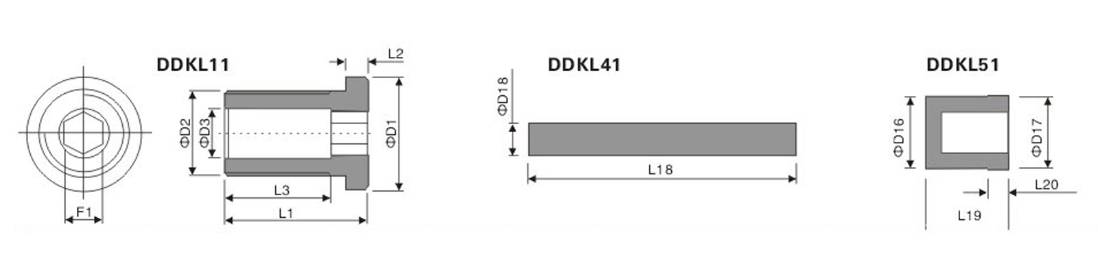 | 型號 | 尺寸 | D1 | D2 | D3 | L1 | L2 | L3 | F1 | 型號 | 尺寸 | D15 | L18 | 型號 | 尺寸 | D16 | D17 | L19 | L20 |
