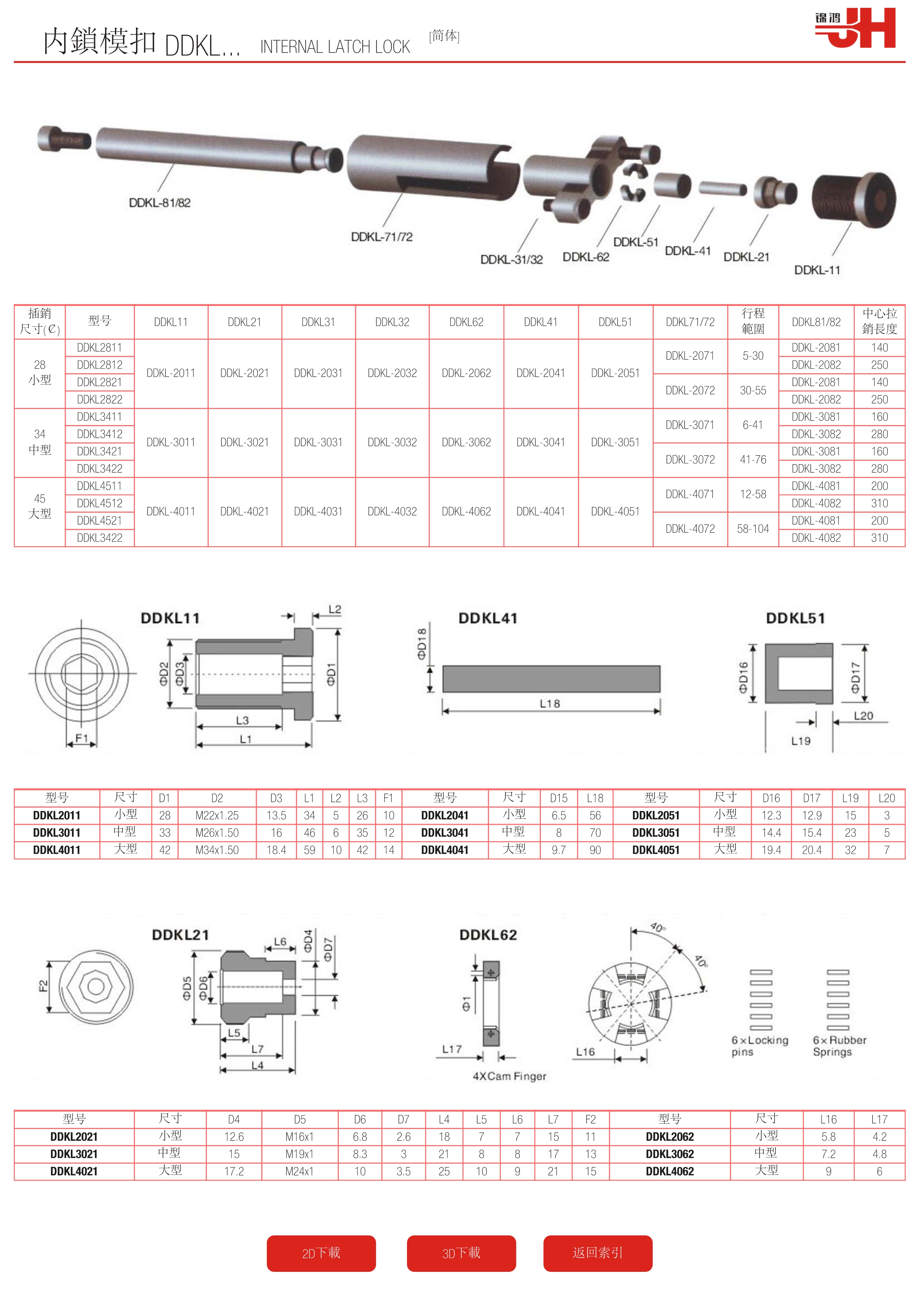 | 插銷 尺寸(¢) | 型號 | DDKL11 | DDKL21 | DDKL31 | DDKL32 | DDKL62 | DDKL41 | DDKL51 | DDKL71/72 | 行程 范圍 | DDKL81/82 | 中心拉 銷長度 |
