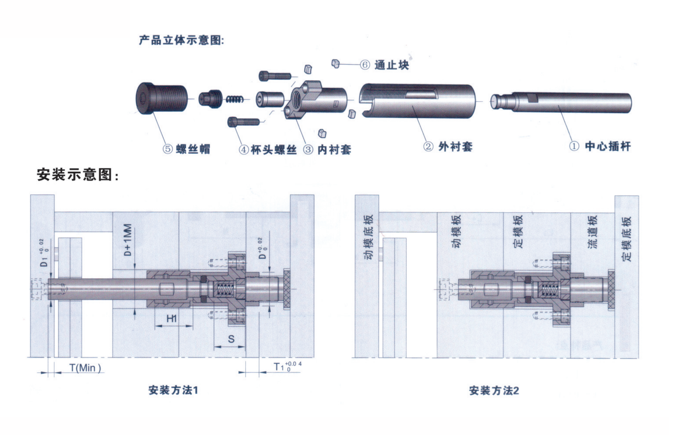 安裝外襯套,通過螺絲帽將外襯套垂直于分型面固定在流道板上,并且要求與內襯套同心;