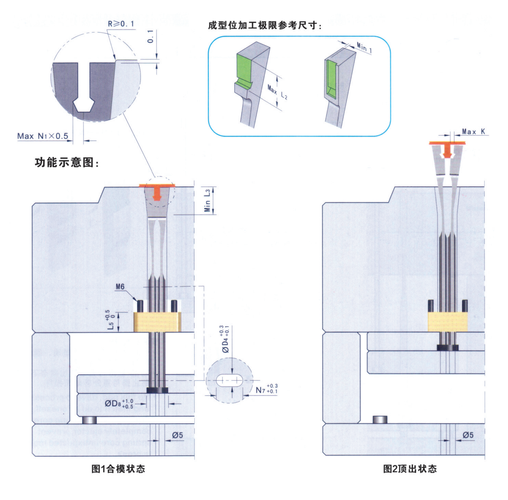 1.安裝在模具型芯內,必須保證彈弓頂針斜面(即膠位背面)與型芯完全貼合 (即保證貼合長度L3值);