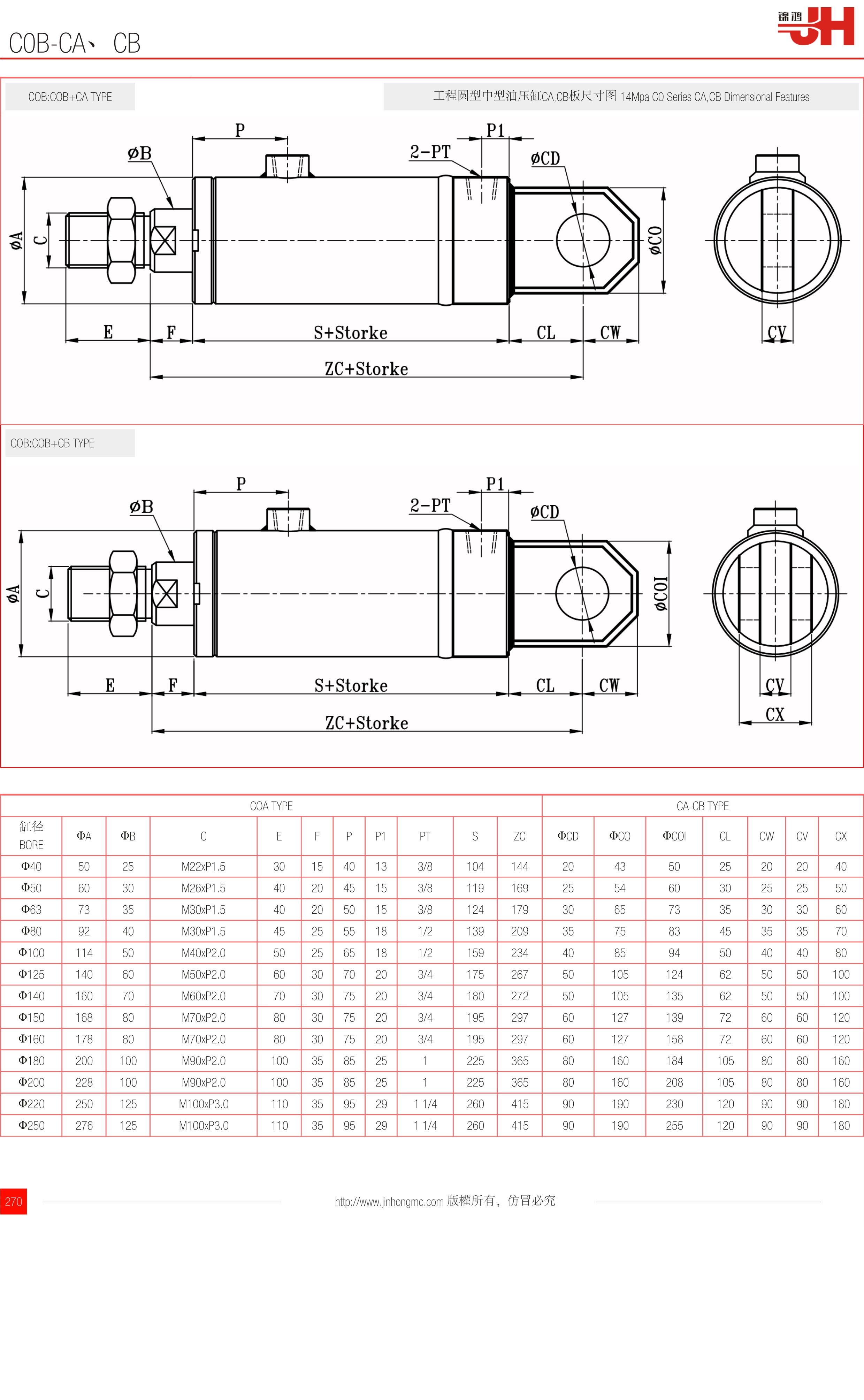 COB:COB+CA TYPE | 工程圓型中型油壓缸CA,CB板尺寸圖 14Mpa C0 Series CA,CB Dimensional Features |