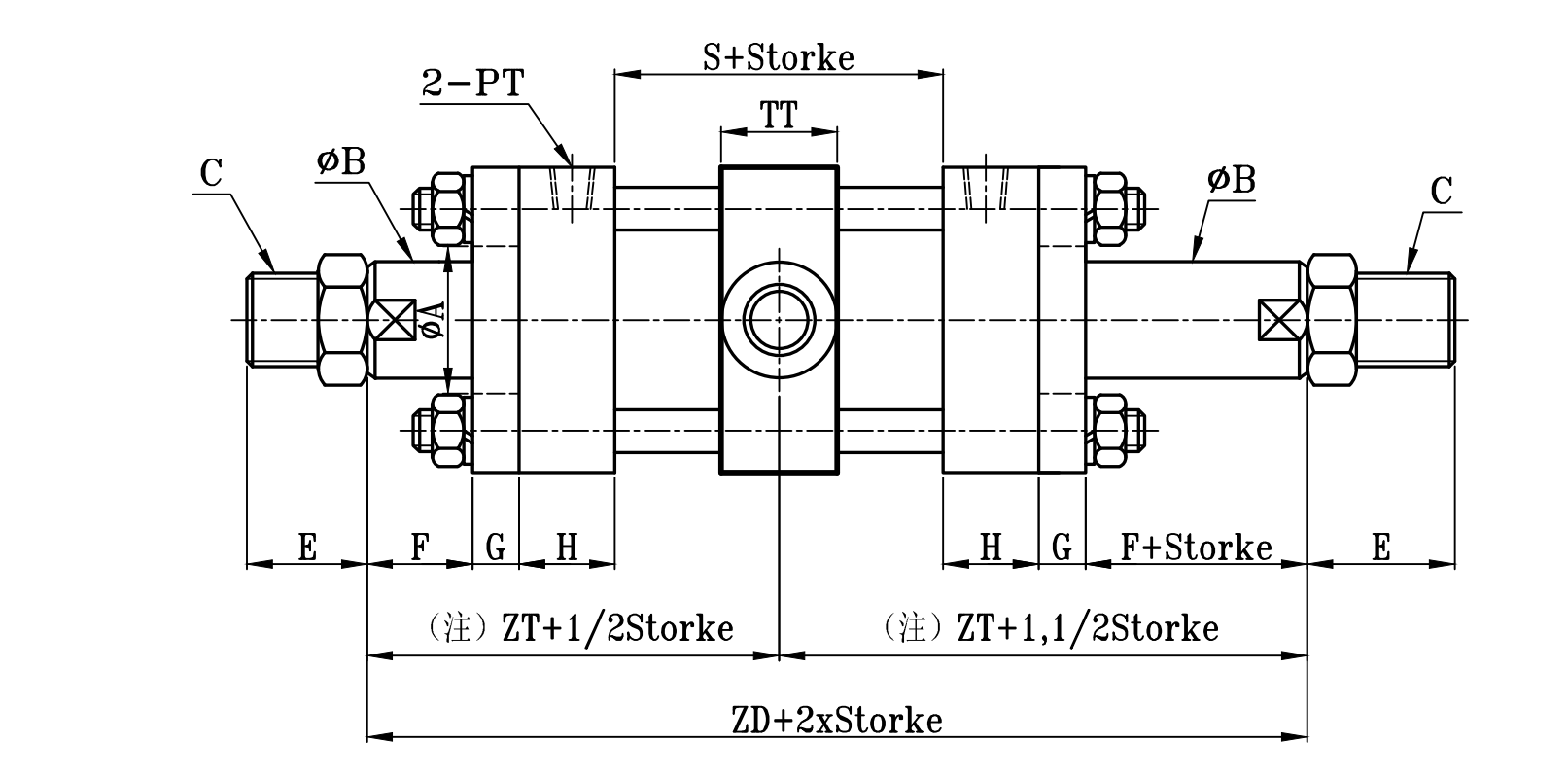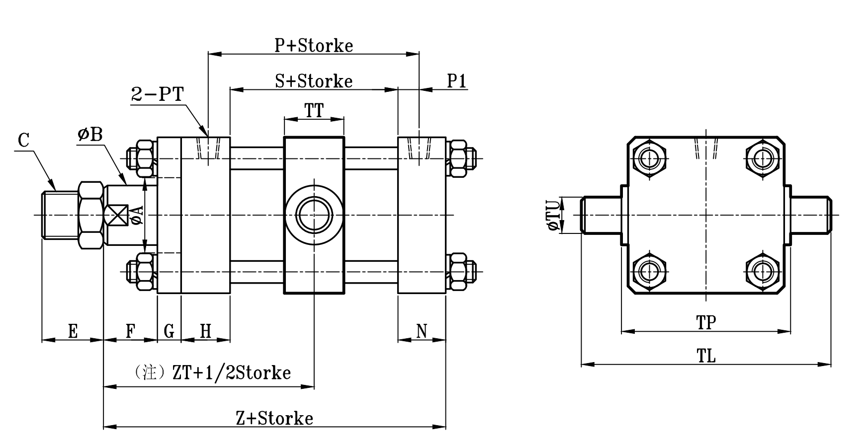 | 缸徑 BORE | ΦA(chǔ) | ΦB | C | E | F | G | H | N | P | P1 | PT | S | Z | ZD | ZT | ΦTU | TL | TP | TT |