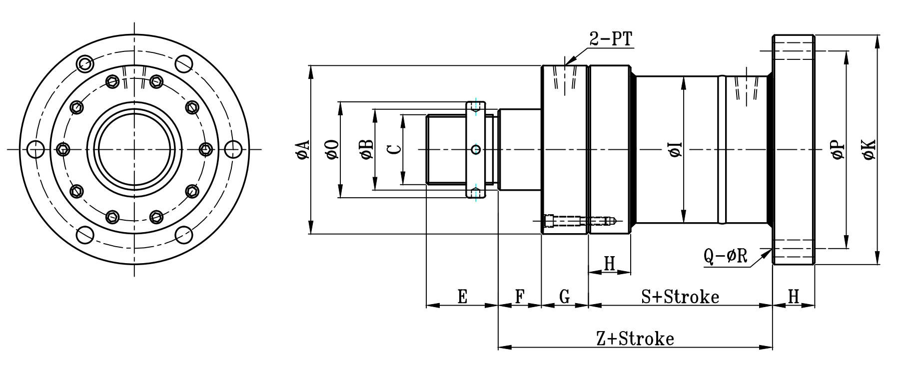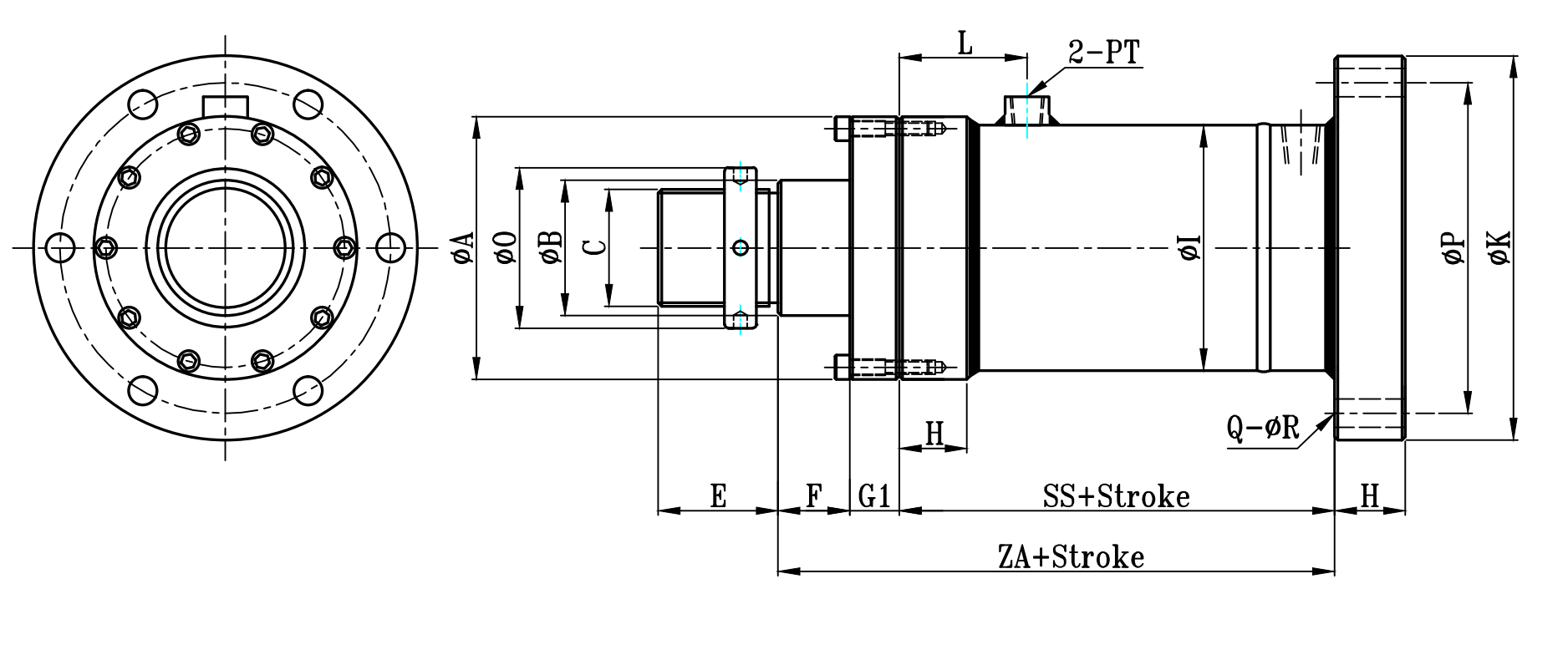 | 缸徑 BORE | ΦA | ΦB | C | L | H | ΦI | ΦK | ΦP | Φ0 | E | F | G | G1 | S | SS | Z | ZA | Q | ΦR | PT |