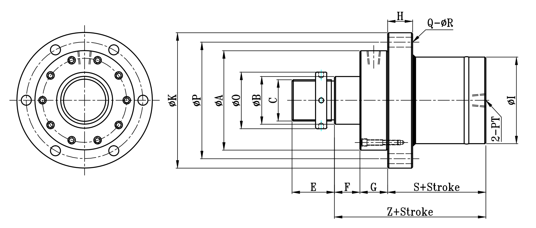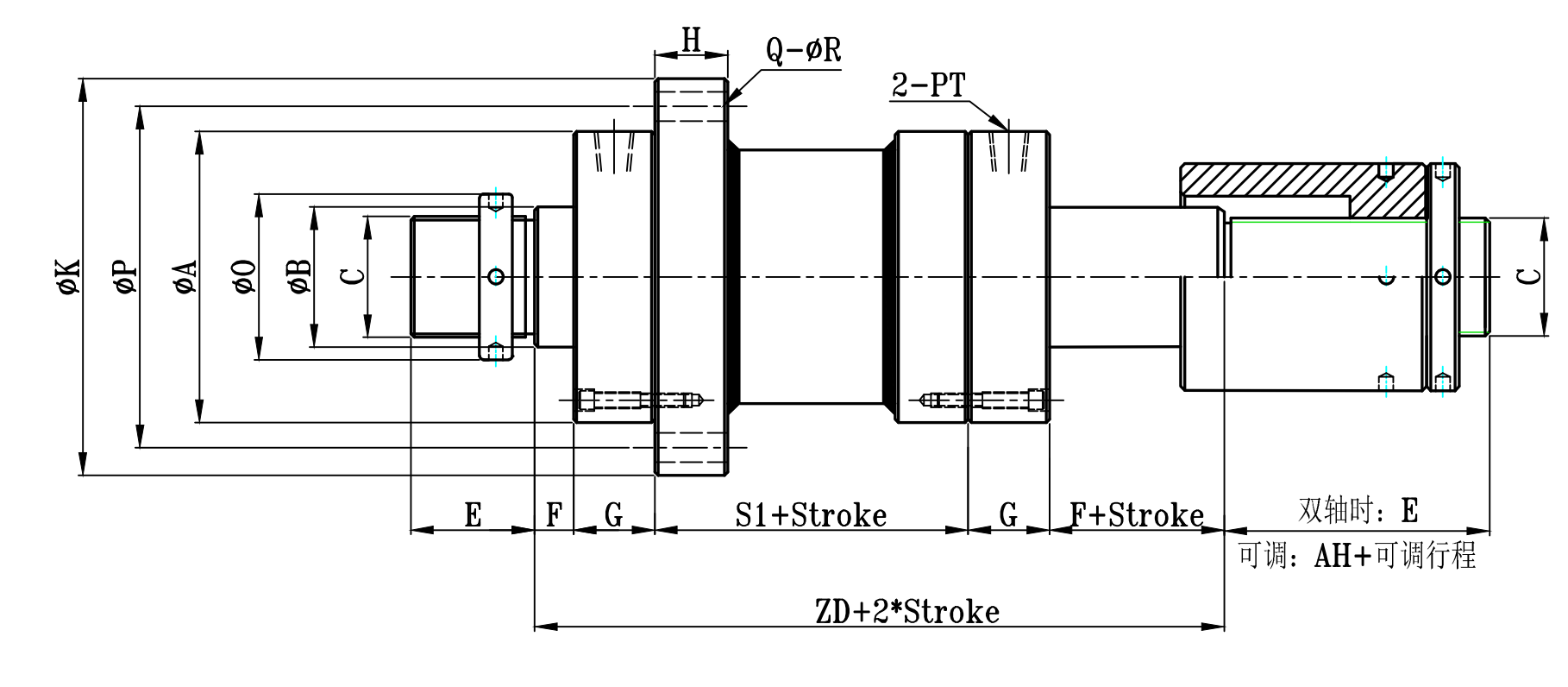 | 缸徑 BORE | ΦA(chǔ) | ΦB | C | H | ΦI | ΦK | ΦP | Φ0 | E | F | G | S | S1 | Z | ZD | AH | Q | ΦR | PT |