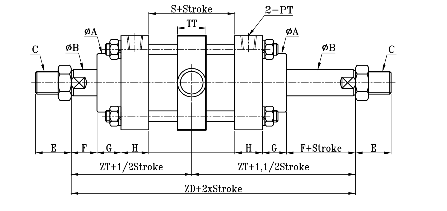 | 缸徑 BORE | ΦA(chǔ) | ΦB | C | E | F | G | H | PT | S | ZD | ZT | TL | TP | TT | ΦTU |