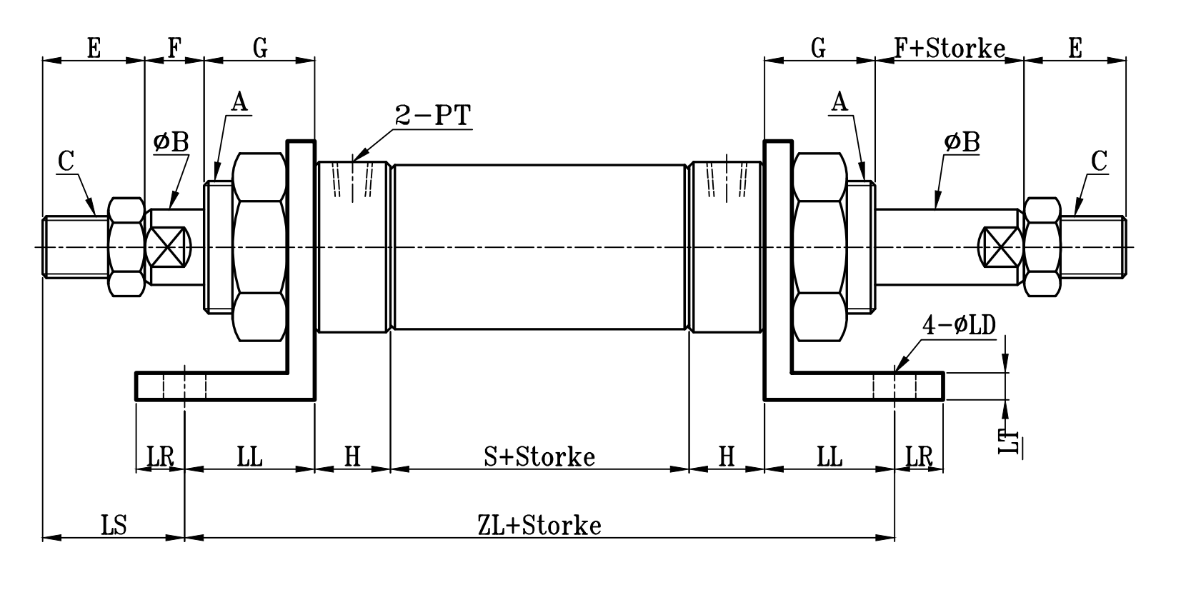 | 缸徑 BORE | A | ΦB | C | E | F | G | H | ΦI | P | P1 | PT | S | LS | ZL | ΦLD | LH | LN | LL | LR | LT | LX | LY |