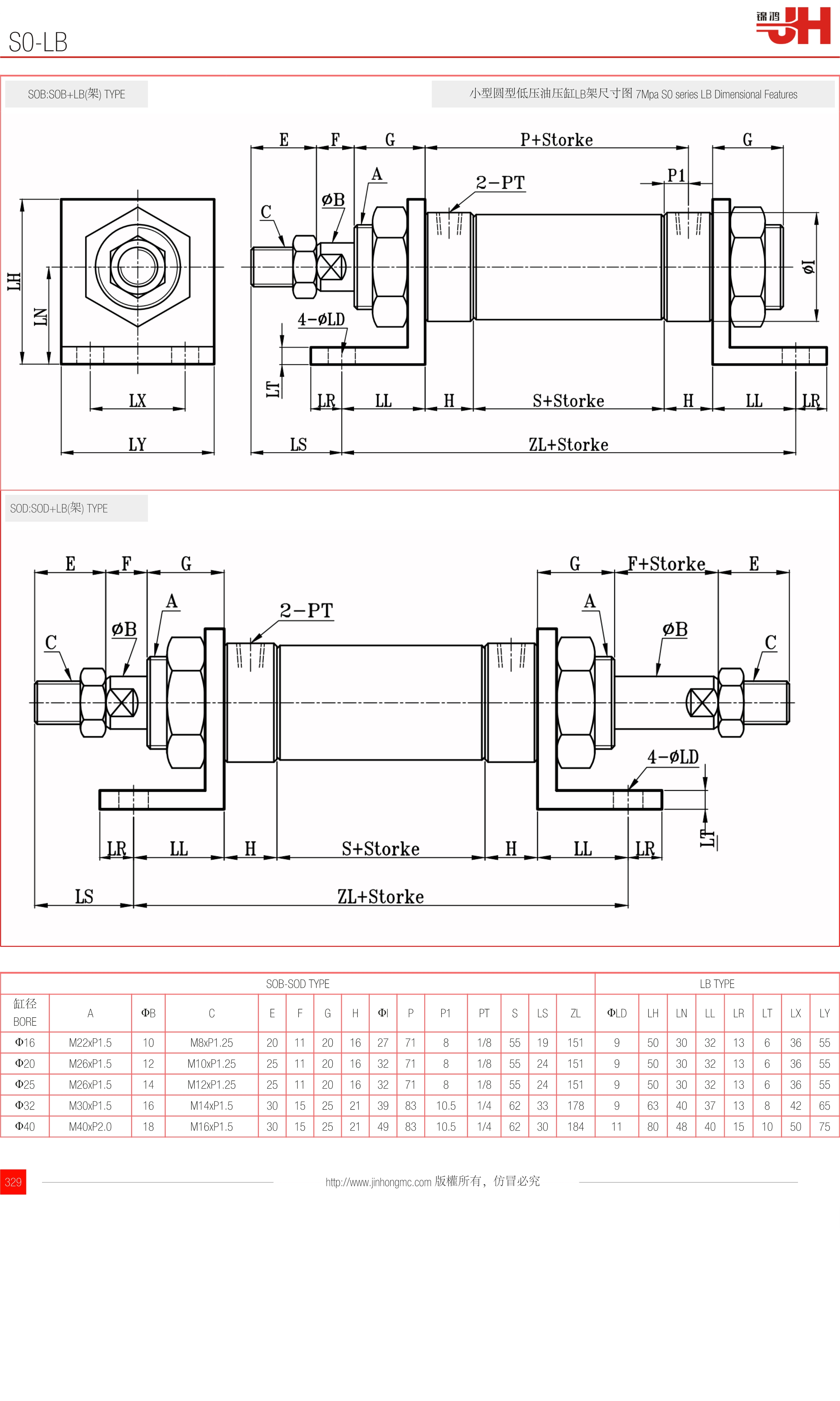 SOB:SOB+LB(架) TYPE | 小型圓型低壓油壓缸LB架尺寸圖 7Mpa S0 series LB Dimensional Features |