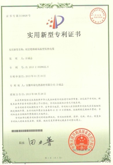環瑞自成立研發小組至科學技術中心期間,通過獨立開發,引進國外先進的生產工藝與技術,與合肥工業大學建立長期合作關系,聘請相關專業的技術專家等模式,投入大量的人力物力。我司以安全,實用性能為目標,通過改變發熱電纜結構與原材料,已研發成功。目前已獲得了關于畜牧養殖專用的國家專利證書,研發出耐高溫,耐磨的雙層絕緣的發熱電纜獲得了2項國家專利證書。包括之間我司獲得的“混凝土養護發熱電纜”“天溝融雪專用發熱電纜”,截止,我司已獲得了5項關于發熱電纜的國家專利證書,我司發熱電纜的生產技術已達到國內先進。共計19項專利。新的專利證書已下達。