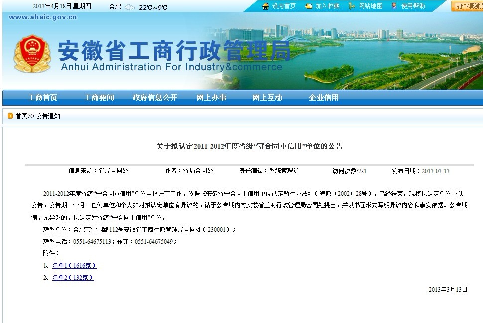 以下為安徽省工商行政管理局網(wǎng)站的公告信息: