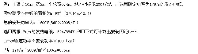 關(guān)于車(chē)道融雪化冰,為節(jié)省出資,不用在車(chē)道整個(gè)區(qū)域鋪設(shè)加熱電纜,通常裝置在車(chē)輪通過(guò)的當(dāng)?shù)鼐妥銐蛄恕?蛇x用單位裝置面積功率為200~250W/㎡,并選用帶地上傳感器的溫控器來(lái)操控。