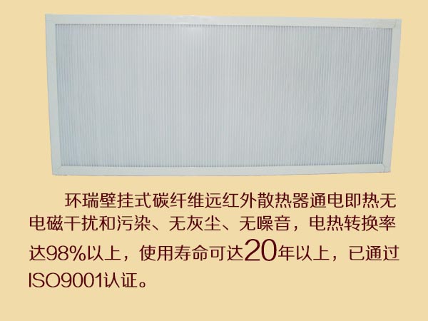 環(huán)瑞壁掛式碳纖維電暖器是采用先進技術(shù)研制開發(fā)的一種新型電采暖的專利產(chǎn)品。采用高科技長絲碳纖維材料制成,具有性能穩(wěn)定,安全可靠,環(huán)保節(jié)電,經(jīng)濟實用等特點。屬于國家認定的綠色環(huán)保電加熱產(chǎn)品。