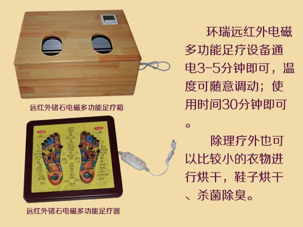 環(huán)瑞遠紅外鍺石電磁多功能足療器和遠紅外鍺石電磁多功能足療箱突破了以往足療器采用電動脈沖等原理,讓人們足底有震動感就能理療的假象。環(huán)瑞暖腳設(shè)備通電后產(chǎn)生17um的遠紅外光波穿過人體真皮組織對足部各個穴位進行效的輻射,促進人體的新陳代謝氣血運行、調(diào)節(jié)內(nèi)臟功能、舒通全身經(jīng)絡(luò),從而達到祛病驅(qū)邪、益氣化瘀、滋補元氣的目的經(jīng)達以按摩治療的效果。