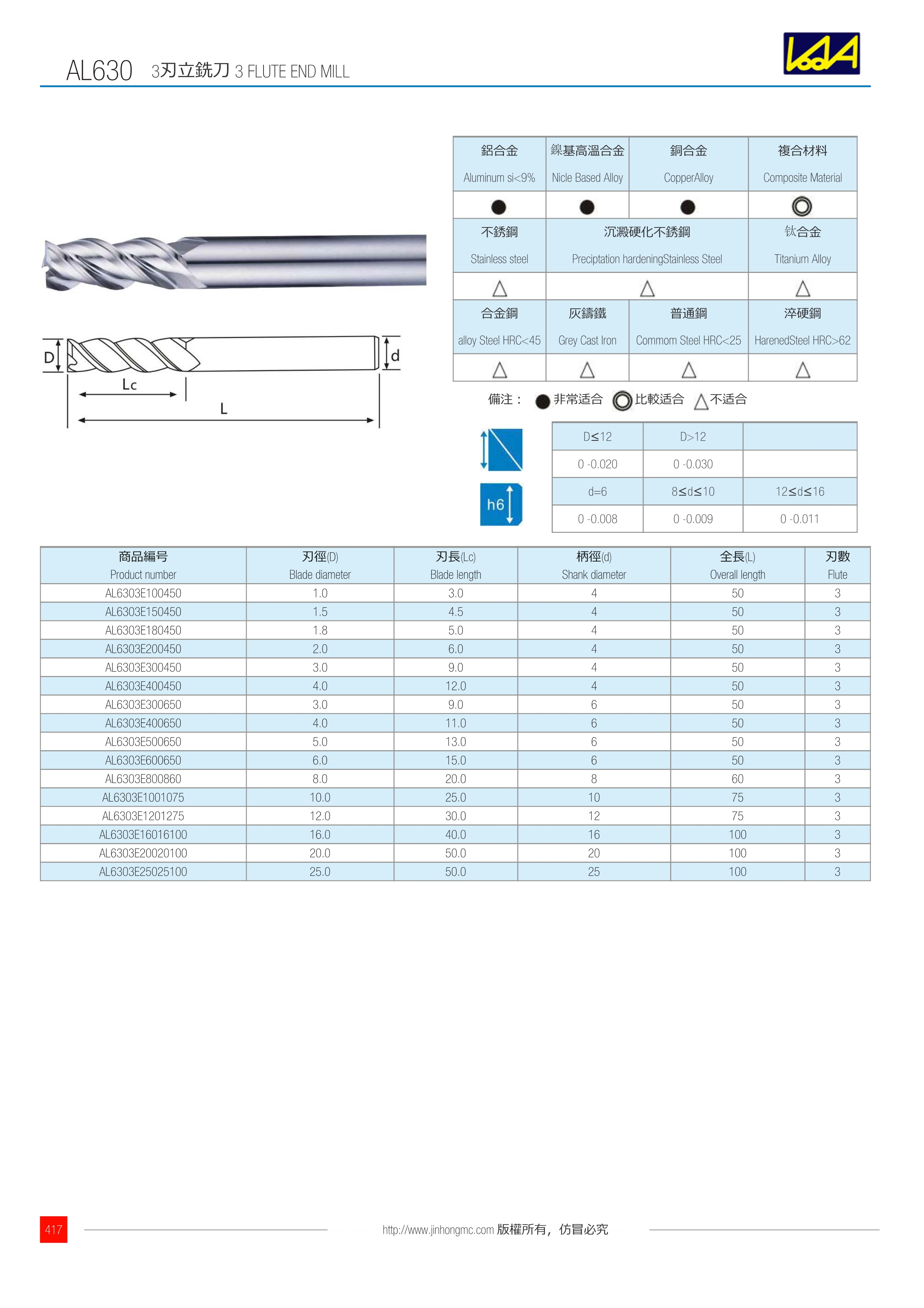 | 商品編號 Product number | 刃徑(D) Blade diameter | 刃長(Lc) Blade length | 柄徑(d) Shank diameter | 全長(L) Overall length | 刃數(shù) Flute |