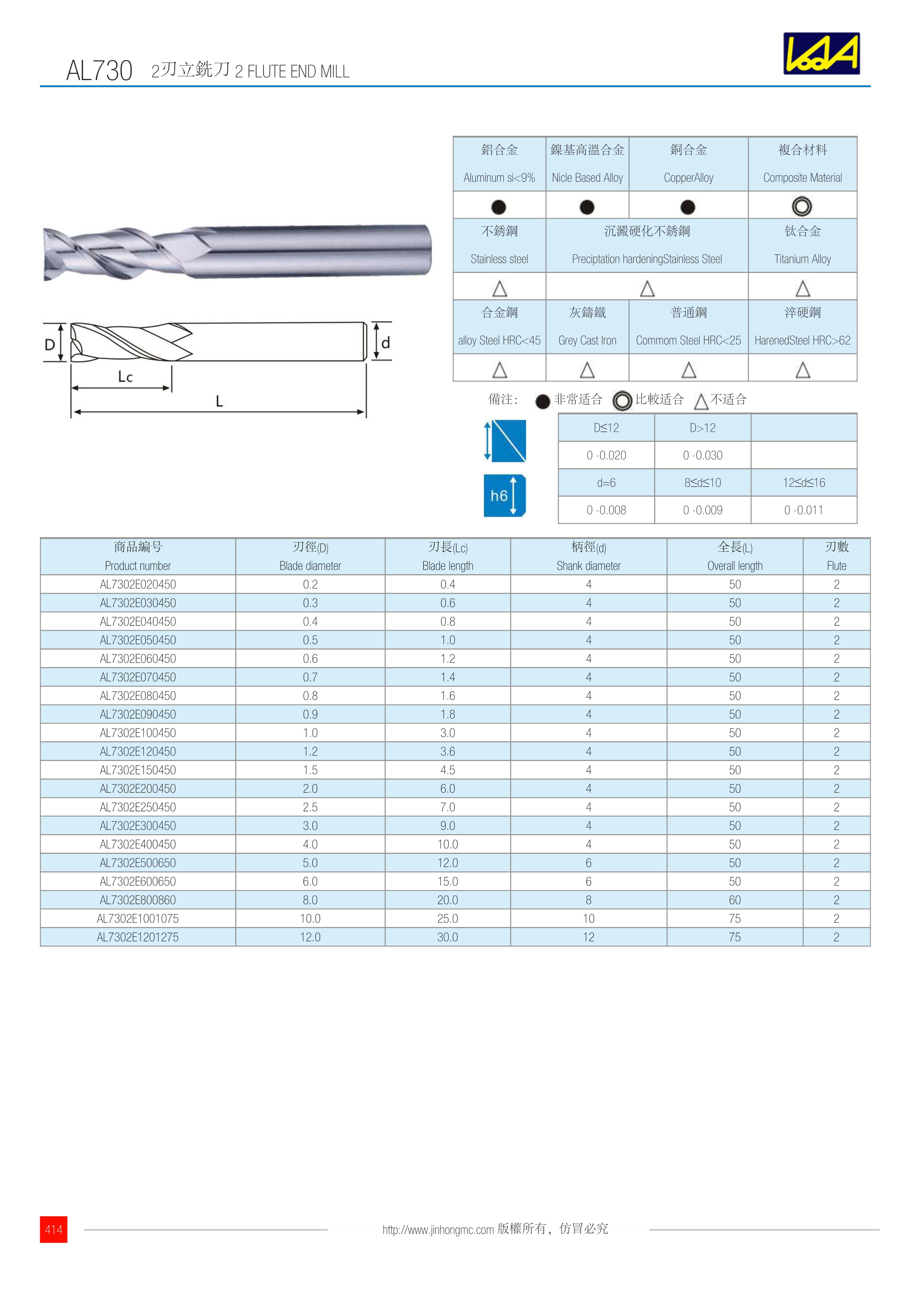 | 商品編號 Product number | 刃徑(D) Blade diameter | 刃長(Lc) Blade length | 柄徑(d) Shank diameter | 全長(L) Overall length | 刃數 Flute |