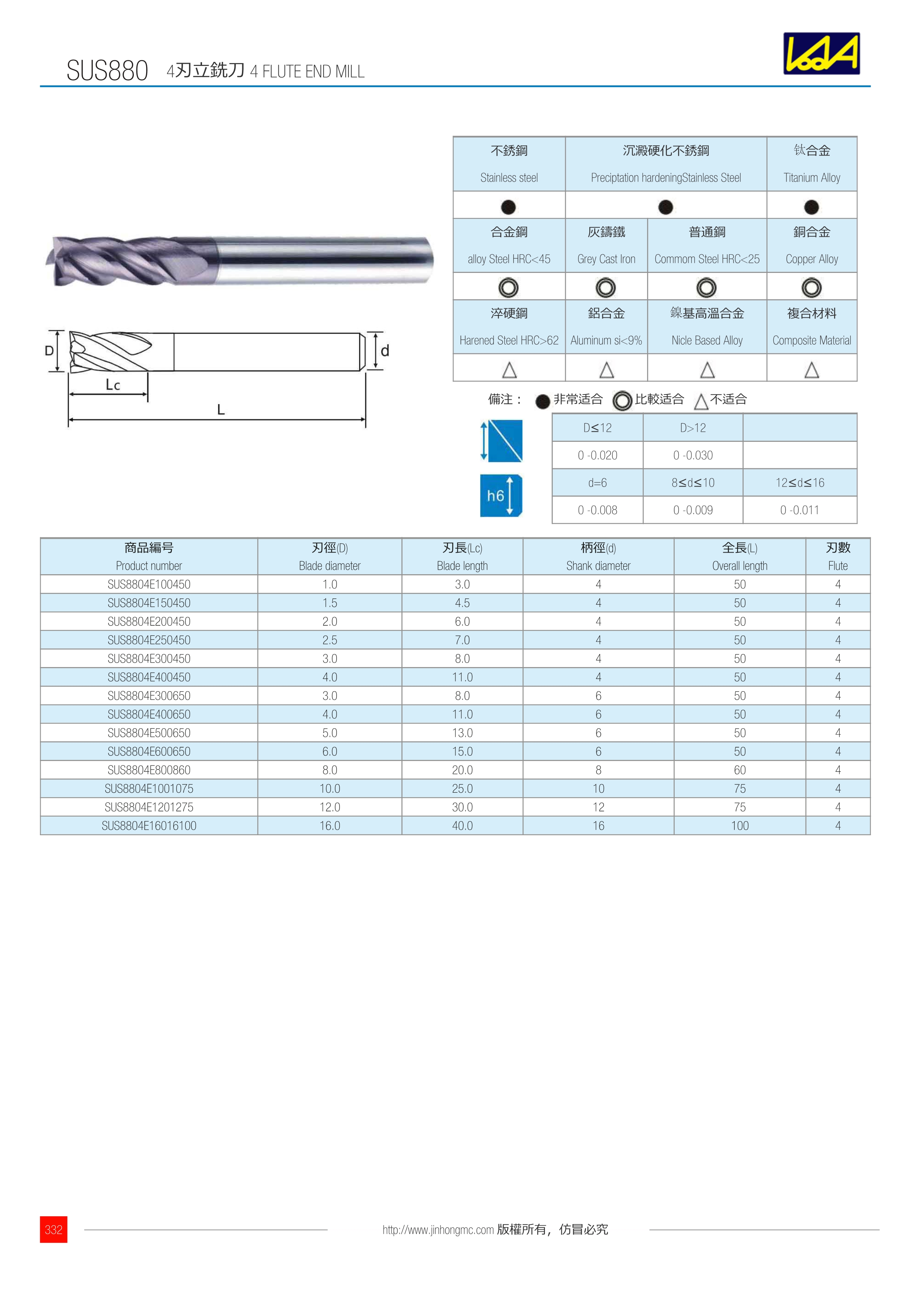 | 商品編號 Product number | 刃徑(D) Blade diameter | 刃長(Lc) Blade length | 柄徑(d) Shank diameter | 全長(L) Overall length | 刃數(shù) Flute |